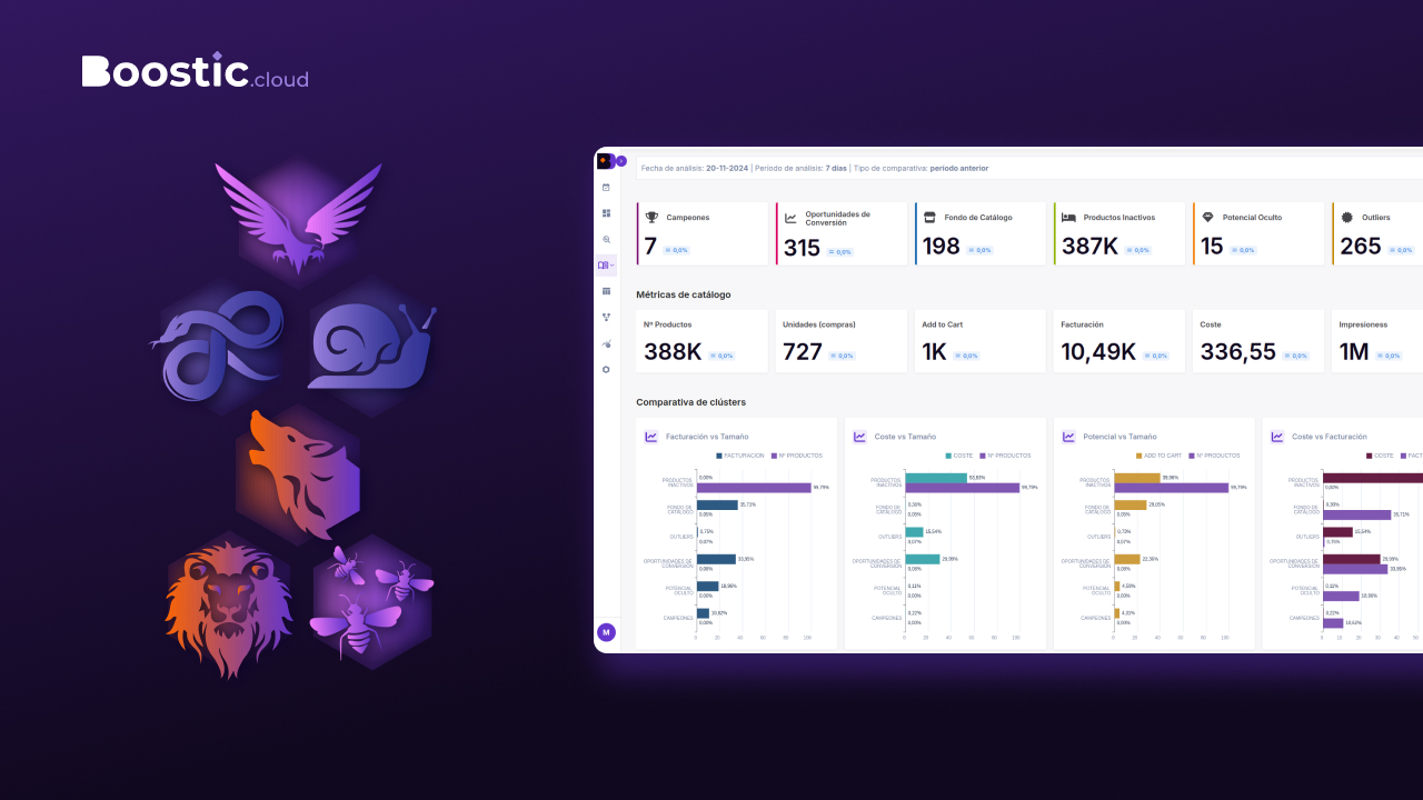 Boostic.cloud integra datos de GA4, Google Ads, Meta Ads, Search Console, Google Merchant y tu e-commerce para darte una visión completa y rentable de tu negocio.